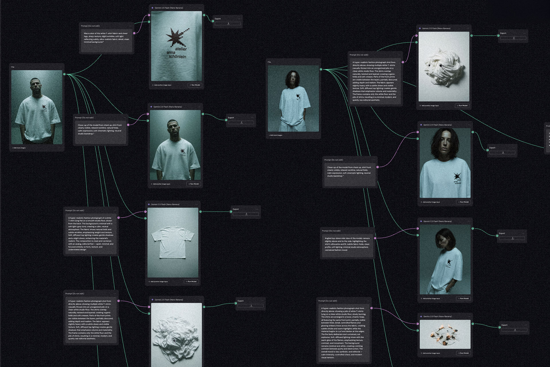 Für Atelier Anna Schönlein entwickelte ich das komplette Corporate Design, inklusive Logo, responsiver Bildmarke, Icons sowie verschiedener Anwendungen in analogen und digitalen Medien. Das System wurde auf Materialien wie Shirts, Fensterbeklebungen und Social-Media-Assets übertragen. Die visuelle Sprache verbindet klare geometrische Linien mit Pixel-Elementen. Inspiriert von der Typografie der analogen VHS-Ära schlägt das Design bewusst eine Brücke zwischen analoger Ästhetik und digitaler Kultur. Ergänzend zur Identität entstanden KI-generierte Visuals, um die gestalteten Shirts in realistischen Szenarien zu zeigen und Content für Social Media zu produzieren. Das Ergebnis ist ein flexibles visuelles System für ein Pop-up-Studio, das sich zwischen Kunst, Mode und kultureller Haltung bewegt. –– For Atelier Anna Schönlein I developed the complete corporate design, including logo, responsive brand mark, icons and a range of applications across physical and digital media. The system was applied to materials such as shirts, window graphics and social media assets. The visual language combines clean geometric lines with pixel elements. Inspired by the typography of the analog VHS era, the design intentionally bridges analog aesthetics with digital culture. Alongside the identity, AI-generated visuals were created to present the designed shirts in realistic scenarios and to produce content for social media. The result is a flexible visual system for a pop-up studio operating between art, fashion and cultural commentary.